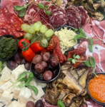 Fad med Parmaskinke, Vitello tonnato, to slags salami, to slags oste, pesto og oliven.